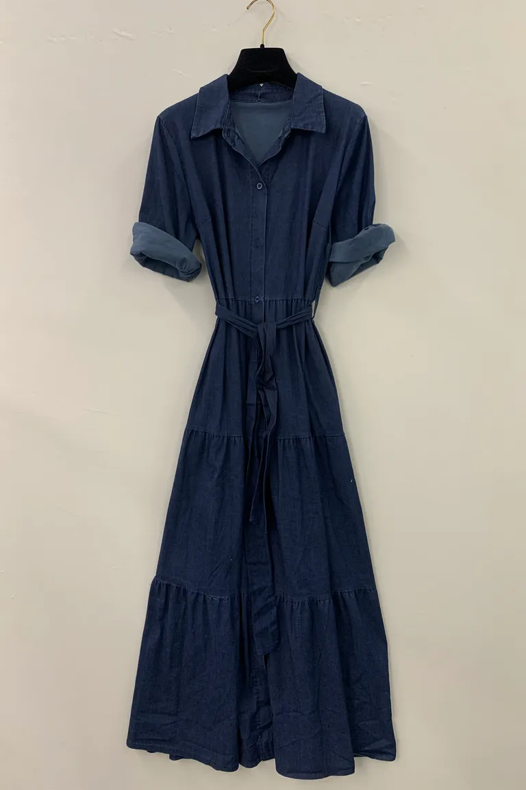 Abito chemisier a balze, tessuto chambray