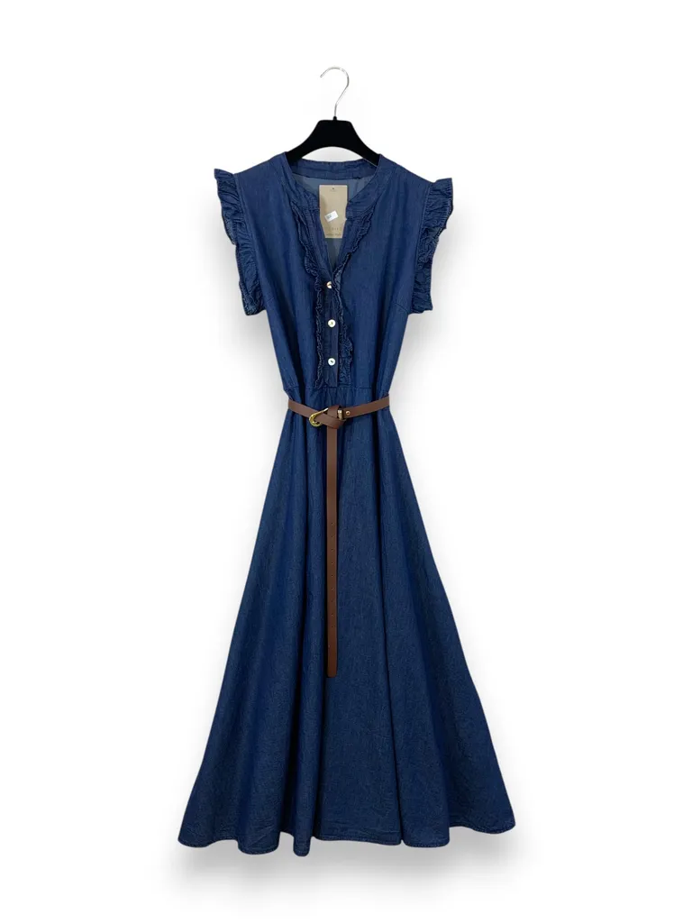 Descrizione Abito lungo smanicato con rouge e bottoni davanti in chambray