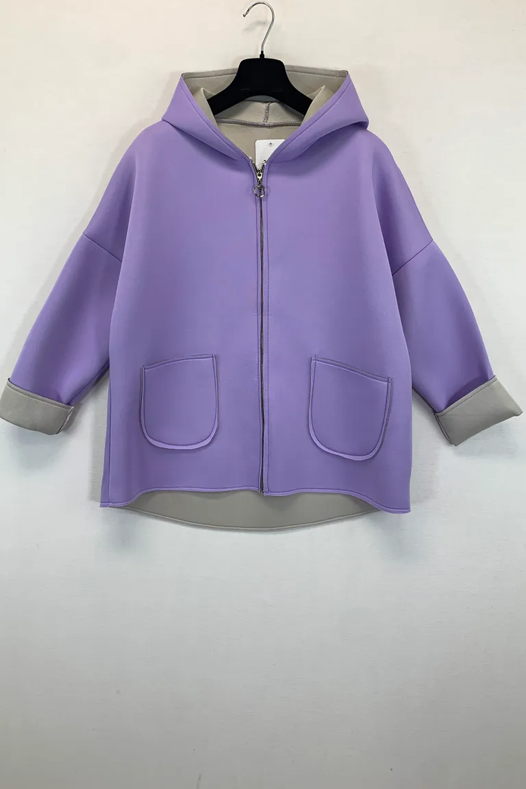 Descrizione Cappotto ampio in scuba, tasche, zip e cappuccio