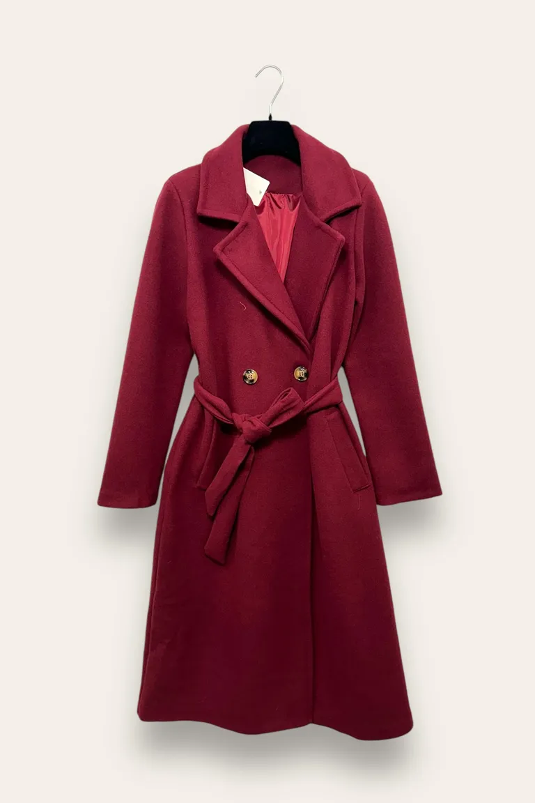 Descrizione Cappotto foderato misto lana, doppiopetto e cintura