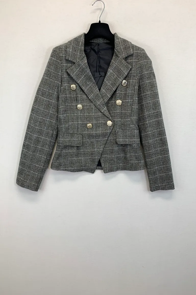 Descrizione Giacca doppiopetto con bottoni gioiello, principe di galles