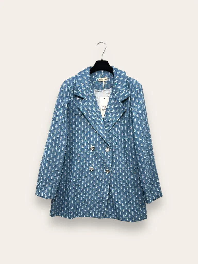 Descrizione Giacca over lunga a strappi con glitter e paillettes, fodera a pizzo