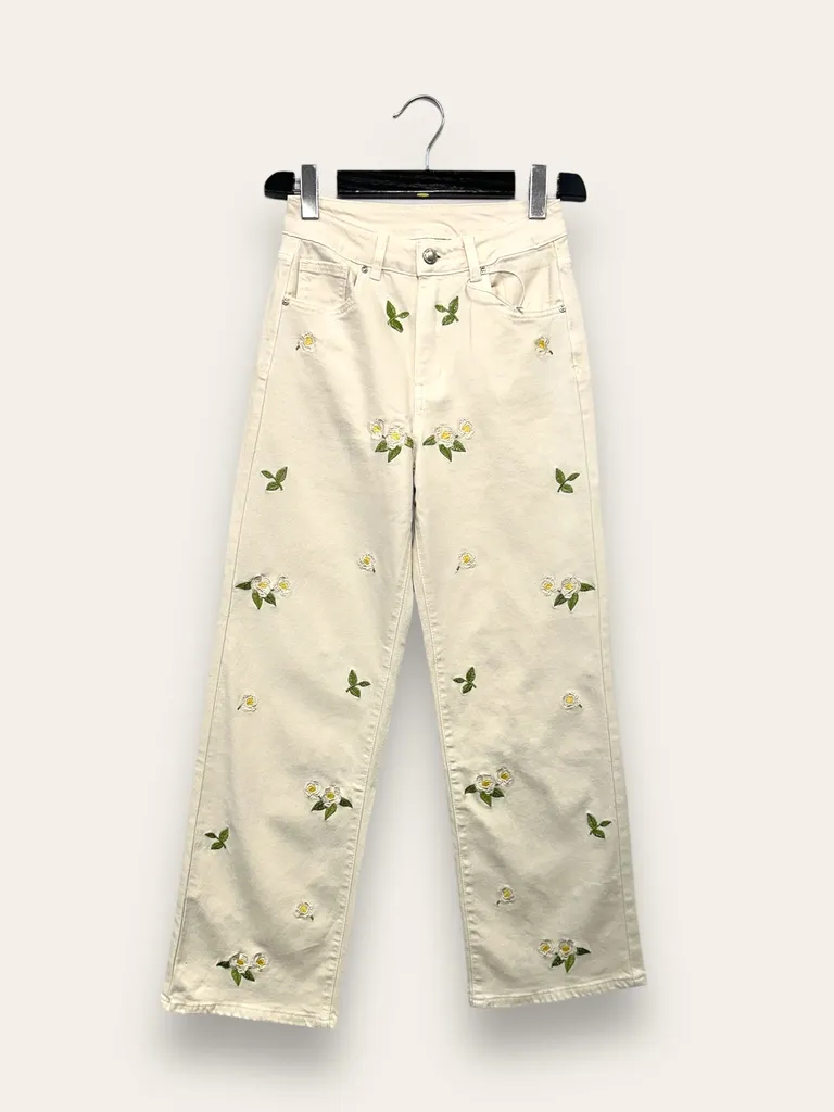Descrizione Pantalone a palazzo con fiori ricamata