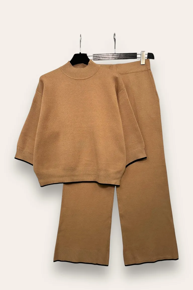 Descrizione Completo maglia manica al gomito e pantalone a palazzo in maglia, fondo a contrasto