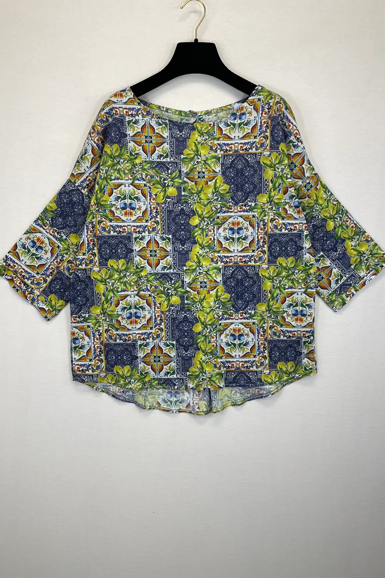 Descrizione Blusa girocollo con manica a pipistrello e 3 bottoni sulla schiena