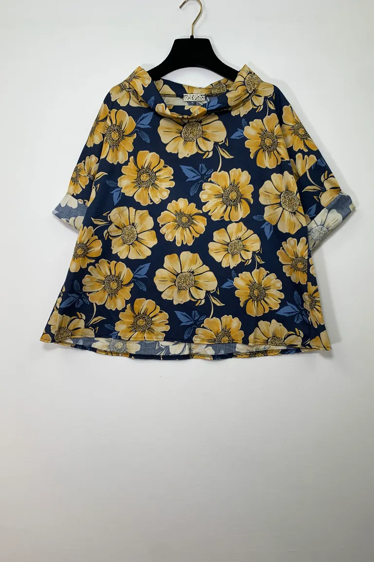 Descrizione Blusa in cotone con collo a ciambella, manica a 3/4