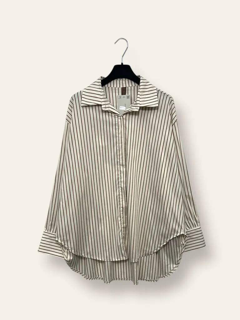 Descrizione Camicia over a righe con ricamo “no vabbè” sulla schiena