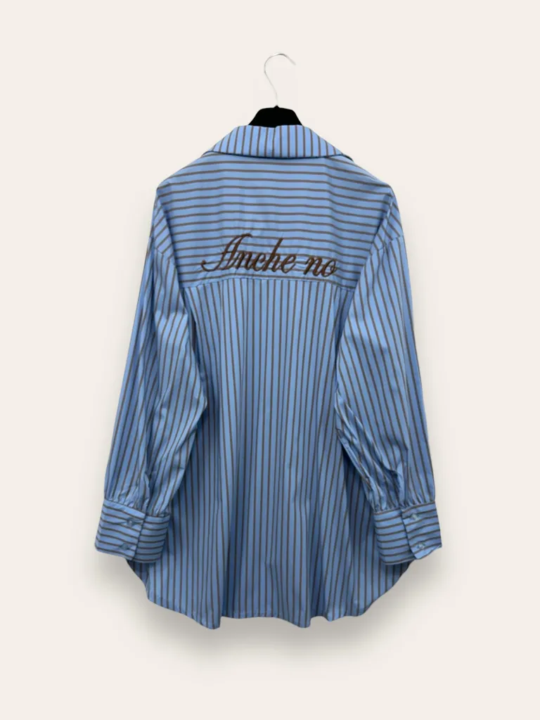 Descrizione Camicia over a righe con ricamo “Anche no” sulla schiena