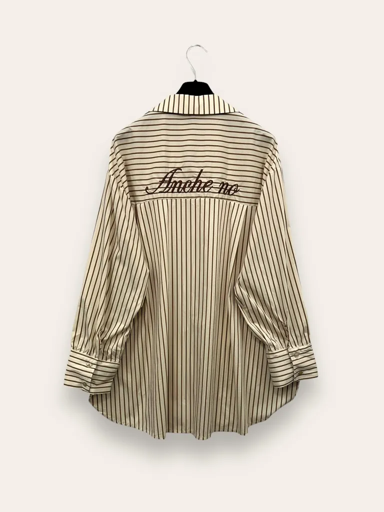 Descrizione Camicia over a righe con ricamo “Anche no” sulla schiena