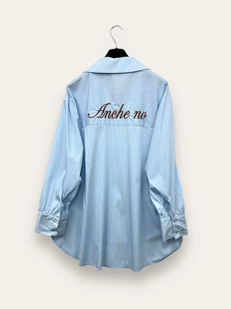 Descrizione Camicia over a righe con ricamo “Anche no” sulla schiena