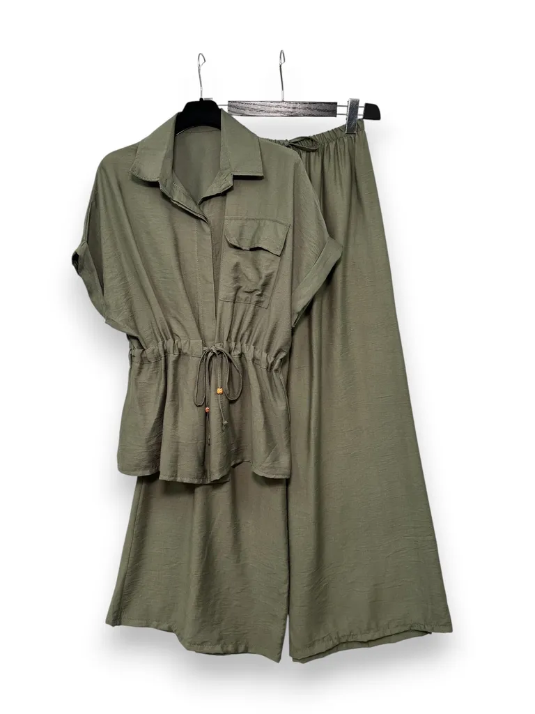 Descrizione Completo pantalone a gamba larga e camicia con coulisse in vita