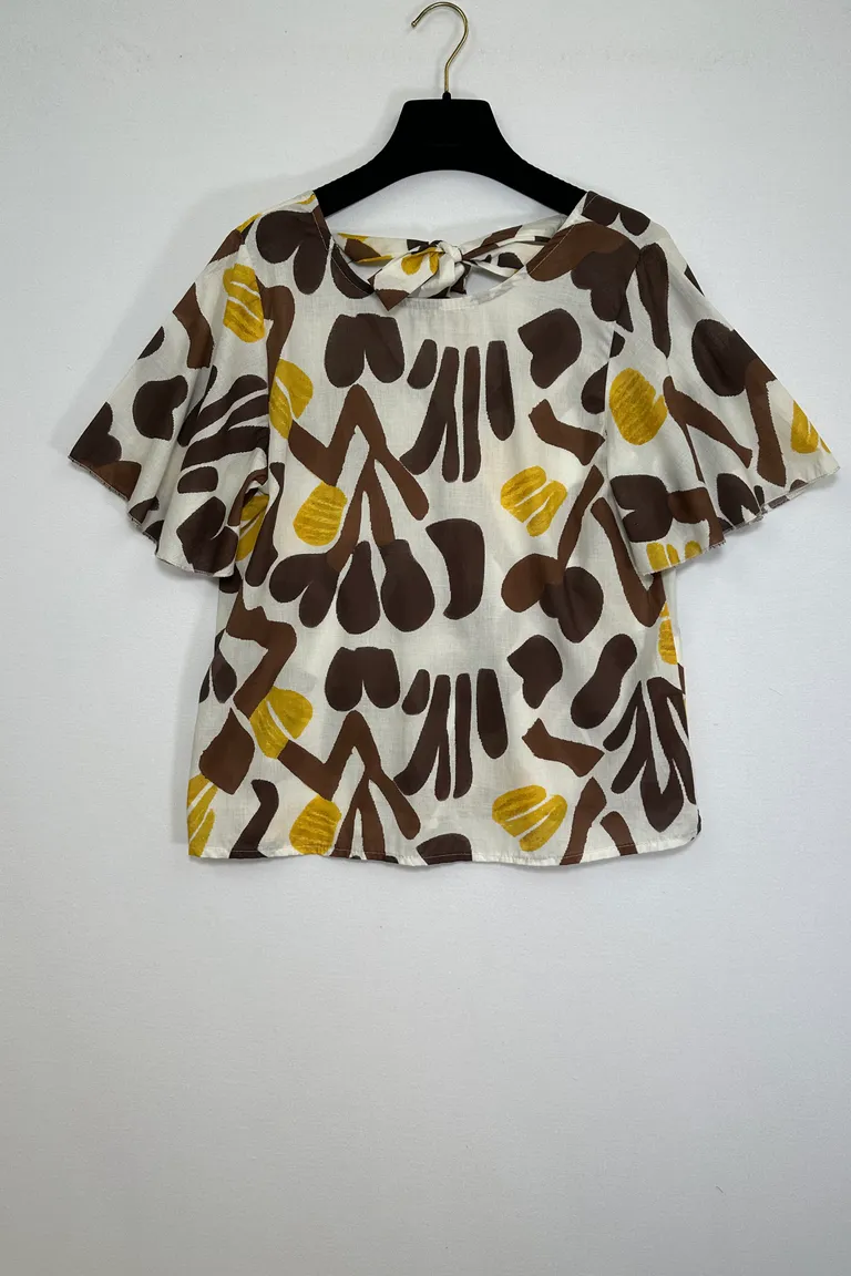 Descrizione Blusa in mussola di cotone in fantasia, con fiocco sulla schiena