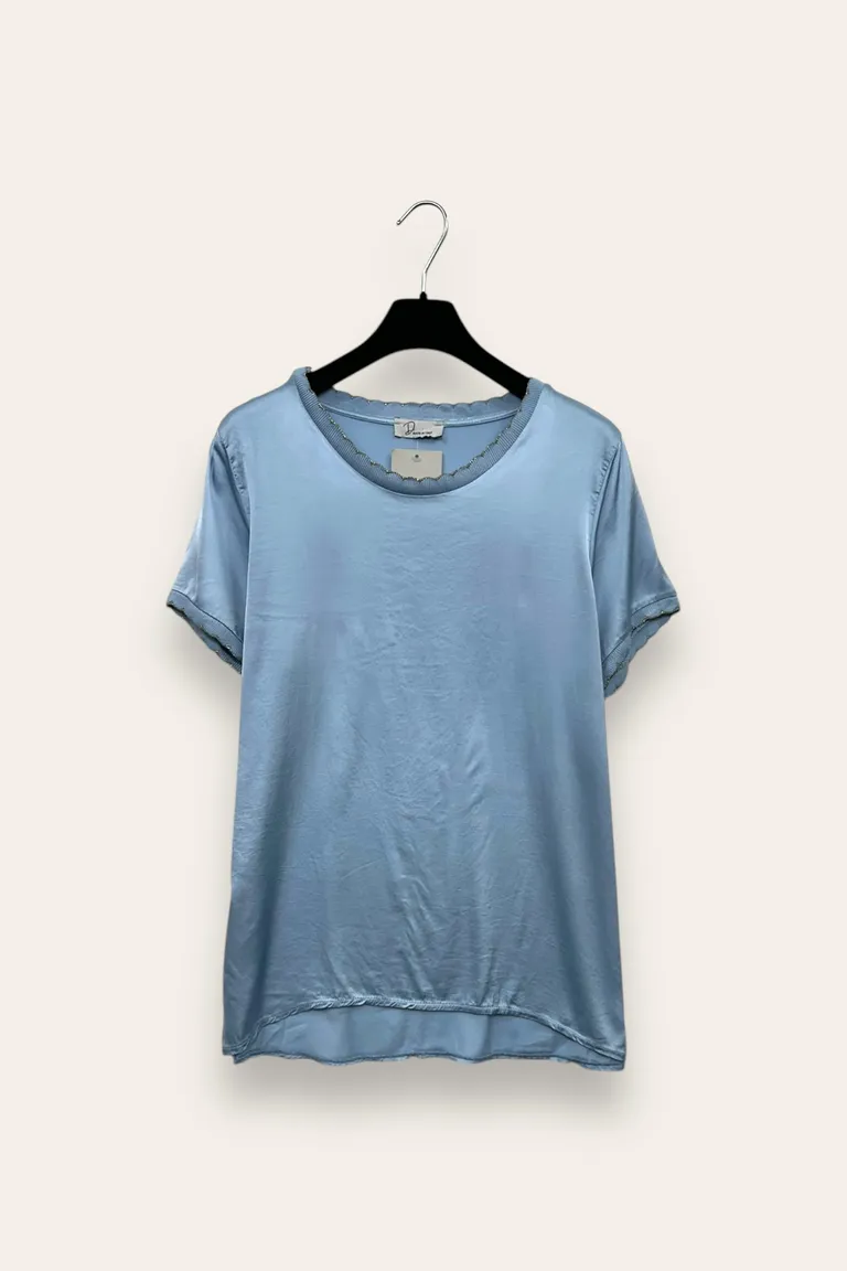 Descrizione Maglietta ampia più lunga dietro in raso in viscosa, profili smerlati con lurex