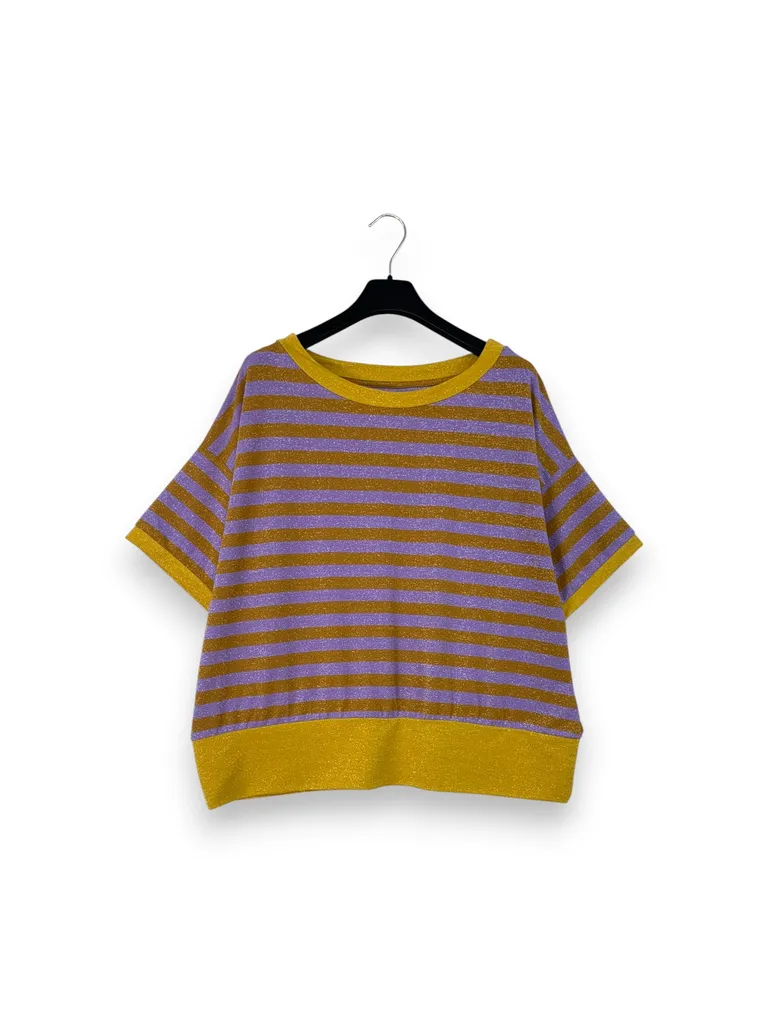 Descrizione Maglietta mezza manica con lurex, a righe con profili a contrasto