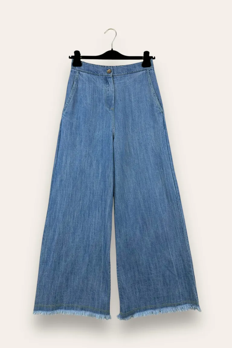 Descrizione Pantalone a palazzo con il fondo sfrangiato ed elastico retro vita