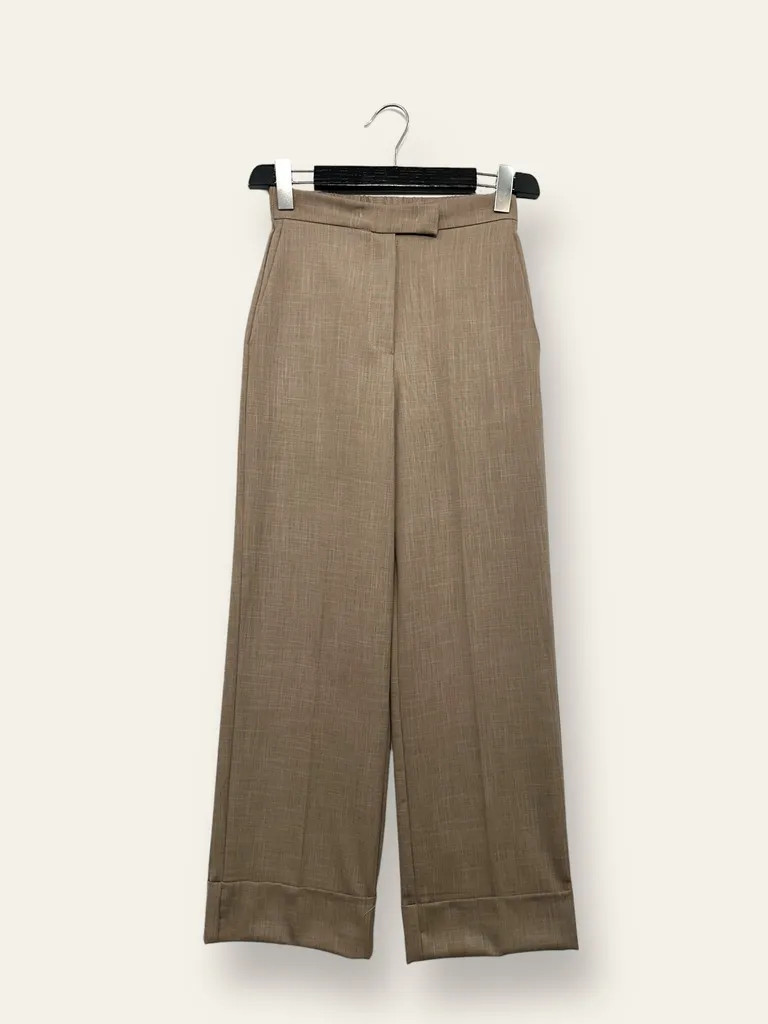 Descrizione Pantalone a palazzo con risvolto al fondo, elastico retro vita