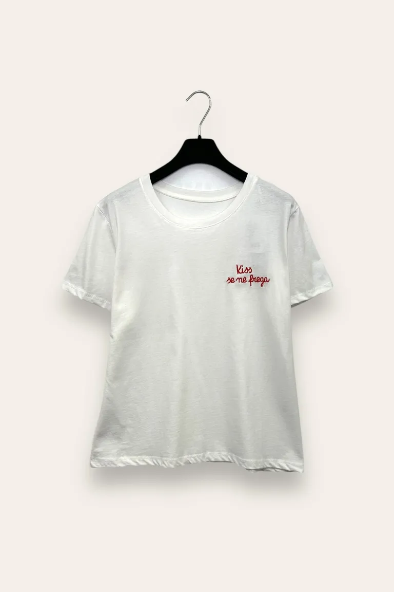 T-shirt con ricamo “kiss se ne frega”