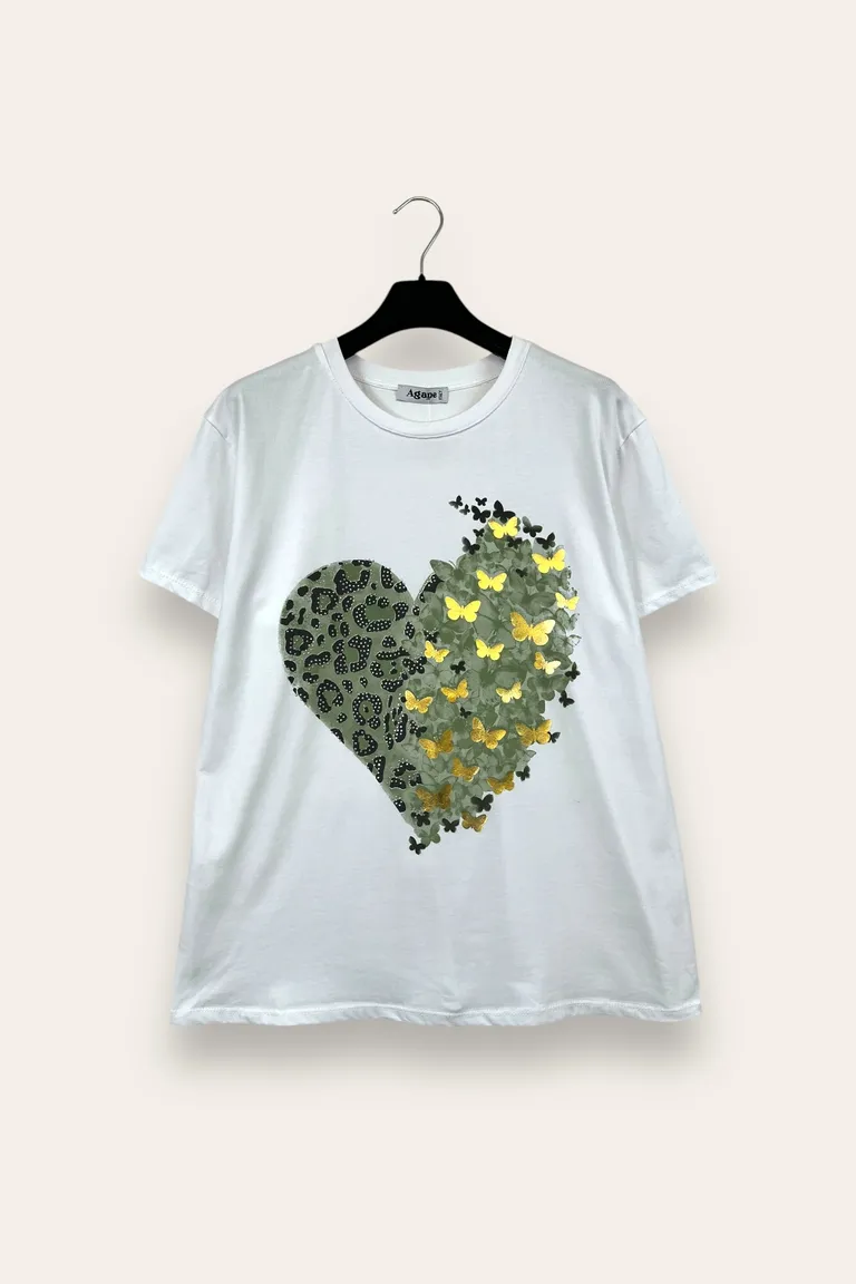 Descrizione T-shirt con cuore, metà strass metà farfalle