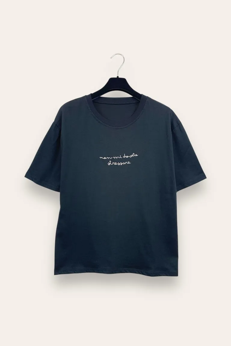 Descrizione T-shirt con scritta ricamata “non mi dovete stressare”
