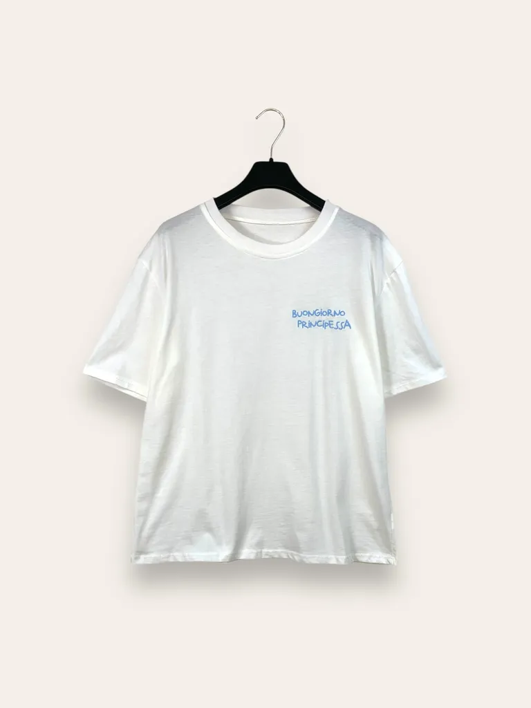 Descrizione T-shirt con scritta ricamata “ buongiorno principessa ”
