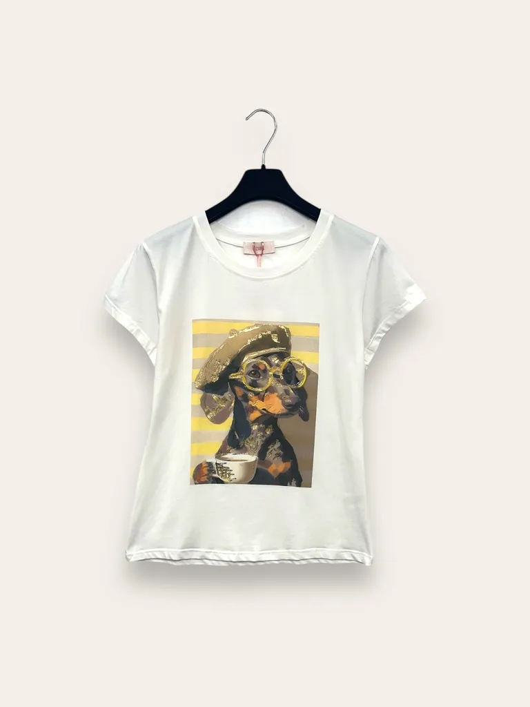 Descrizione T-shirt con stampa cane con occhiali e basco