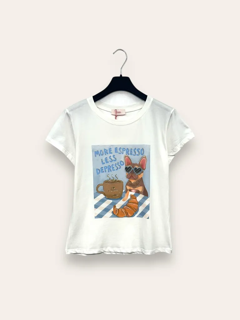 Descrizione T-shirt con stampa bulldog “more espresso less depresso”