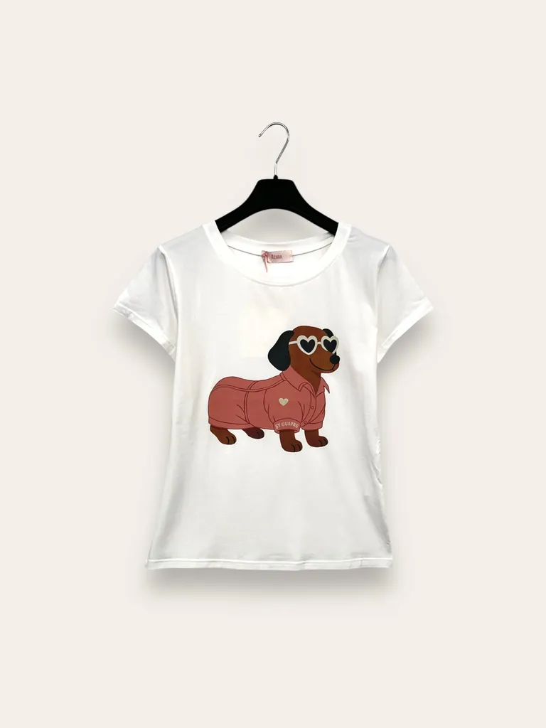Descrizione T-shirt con stampa bassotto con occhiali a cuore