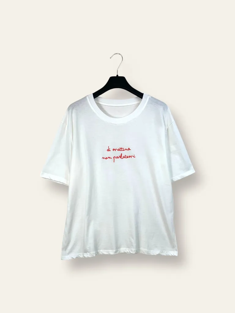 Descrizione T-shirt con scritta ricamata “ di mattina non parlatemi ”