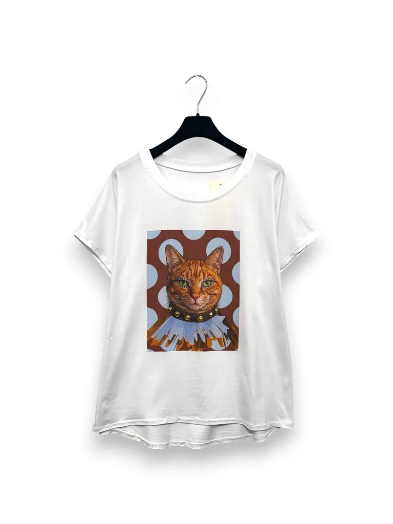 Descrizione T-shirt over stampa gatto con sfondo a pois