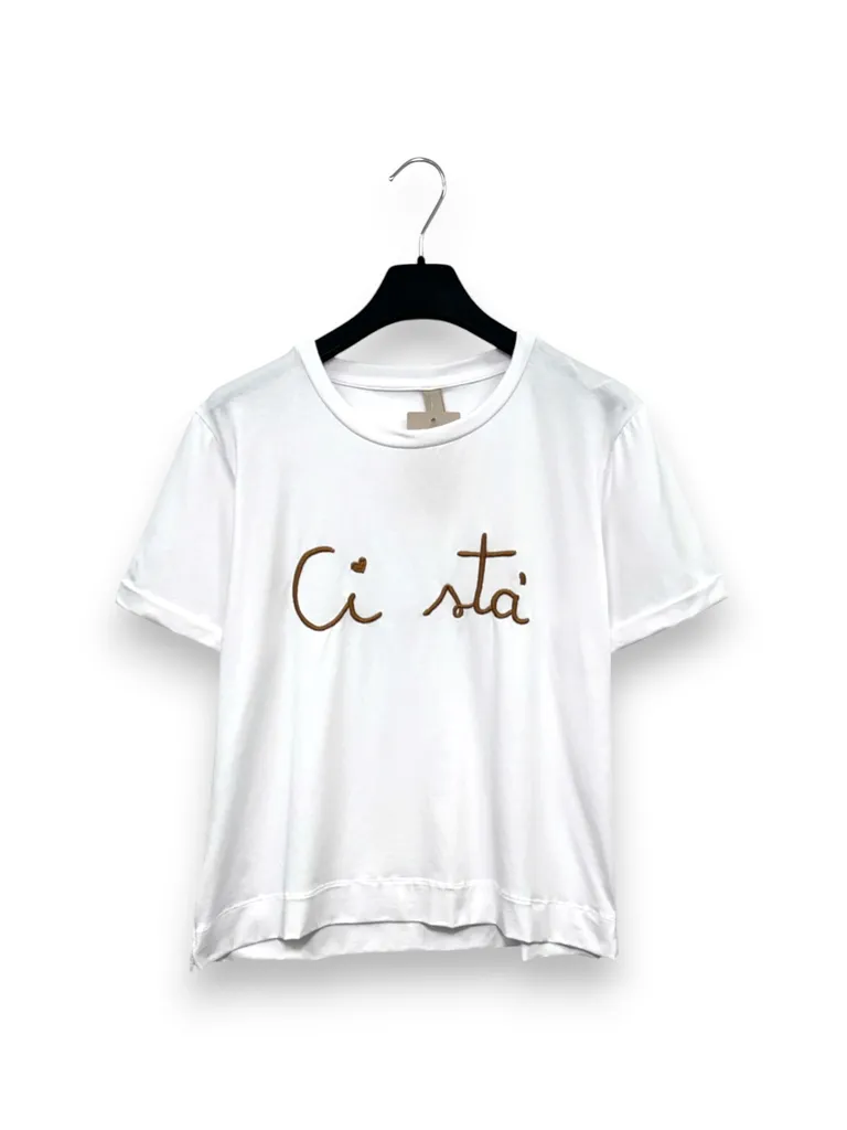 Descrizione T-shirt a scatola, mezza manica con ricamo “ci stà”