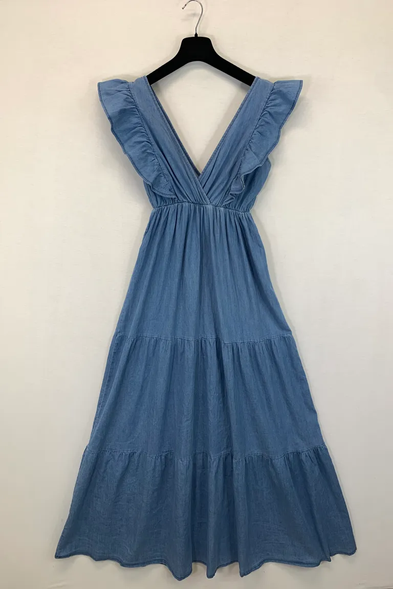 Description Abito chambray a balze, scollo incrociato con volan, effetto jeans