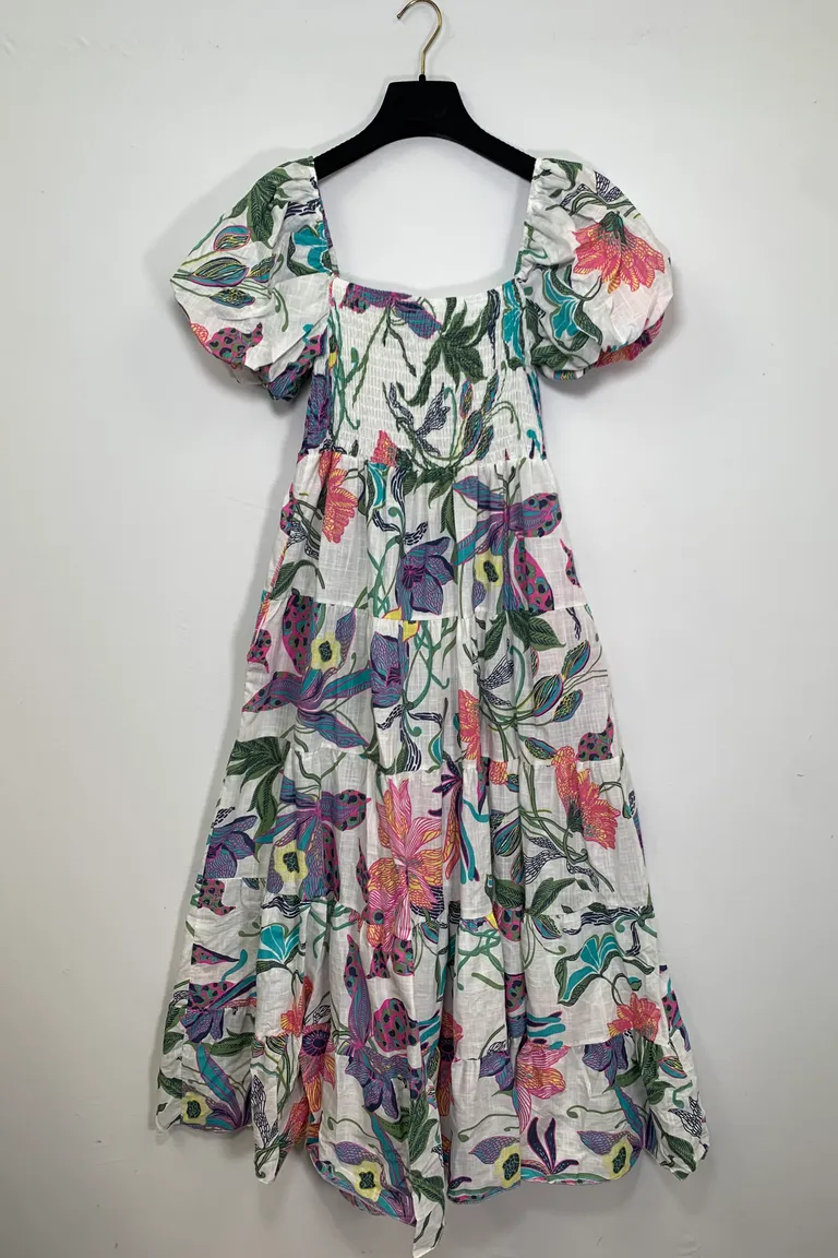 Description Abito lungo in fantasia a balze con corpetto arricciato e maniche a palloncino