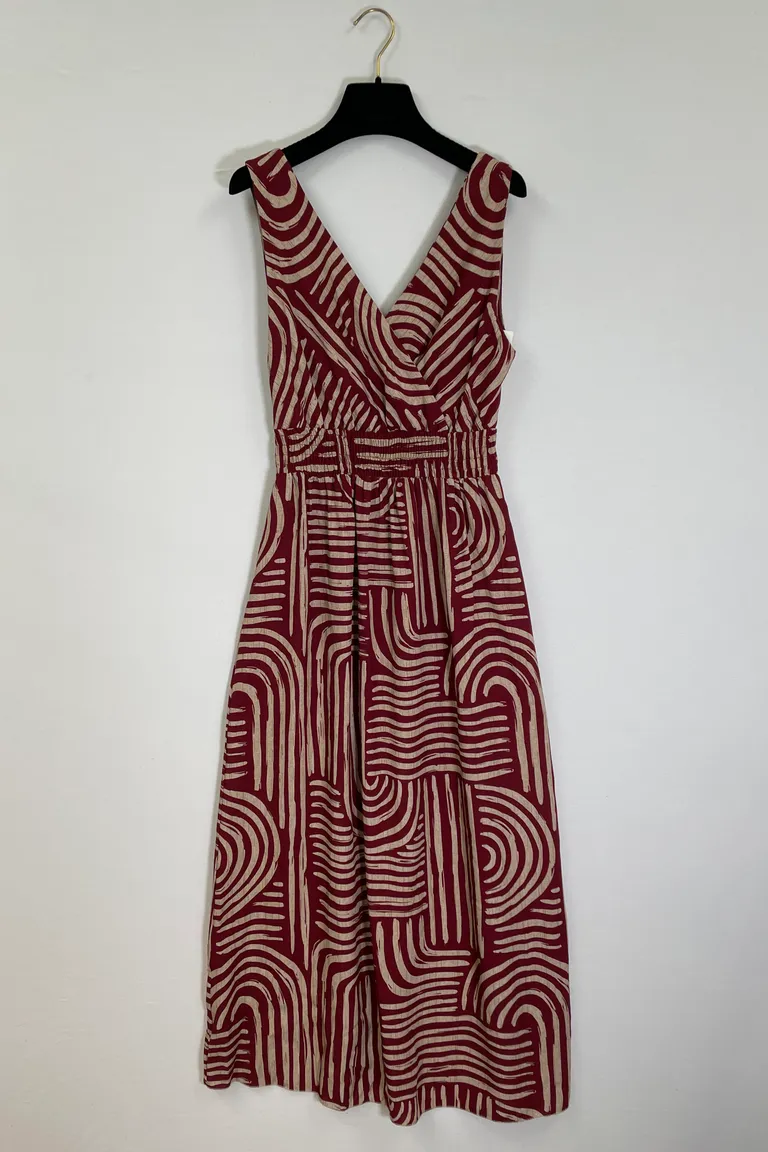 Description Abito in fantasia scollo a V davanti e sulla schiena, arriccio con elastico in vita