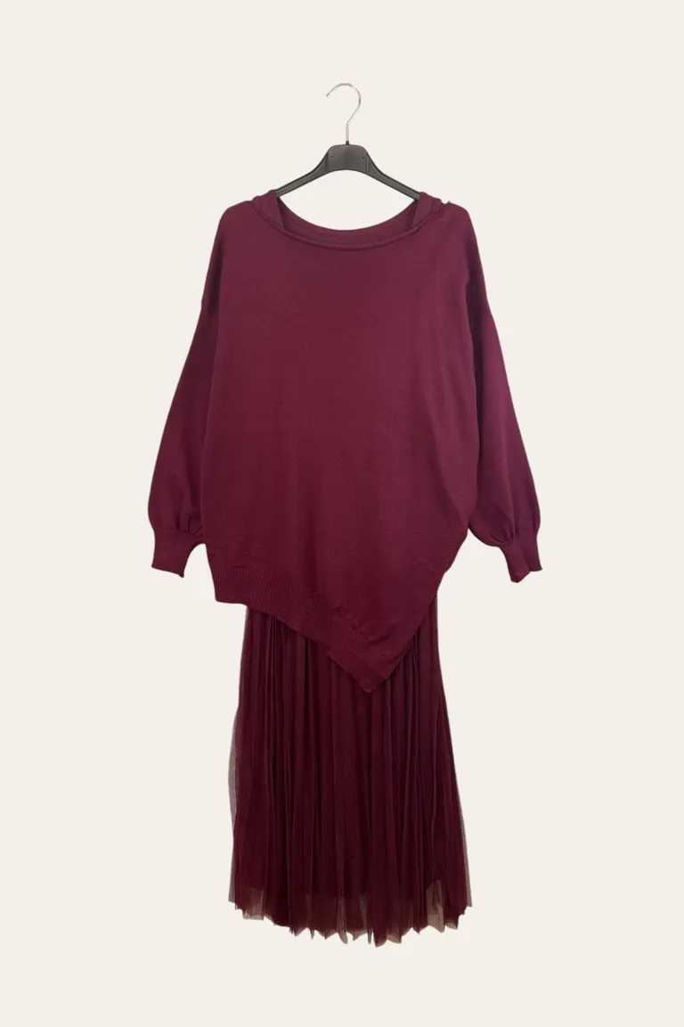 Description Abito twin set con maglia, gonna plissettata in tulle e maglia asimmetrica con spacco laterale