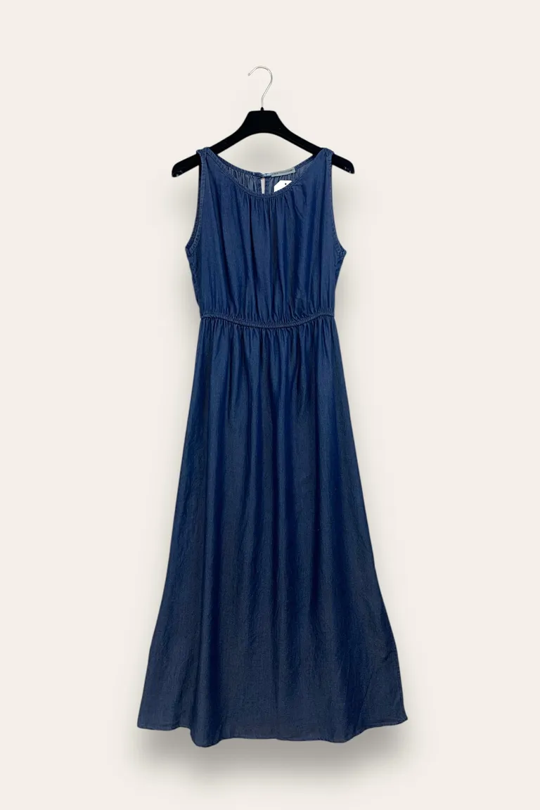 Description Abito in chambray con elastico in vita, con spacco laterale e bottone dietro