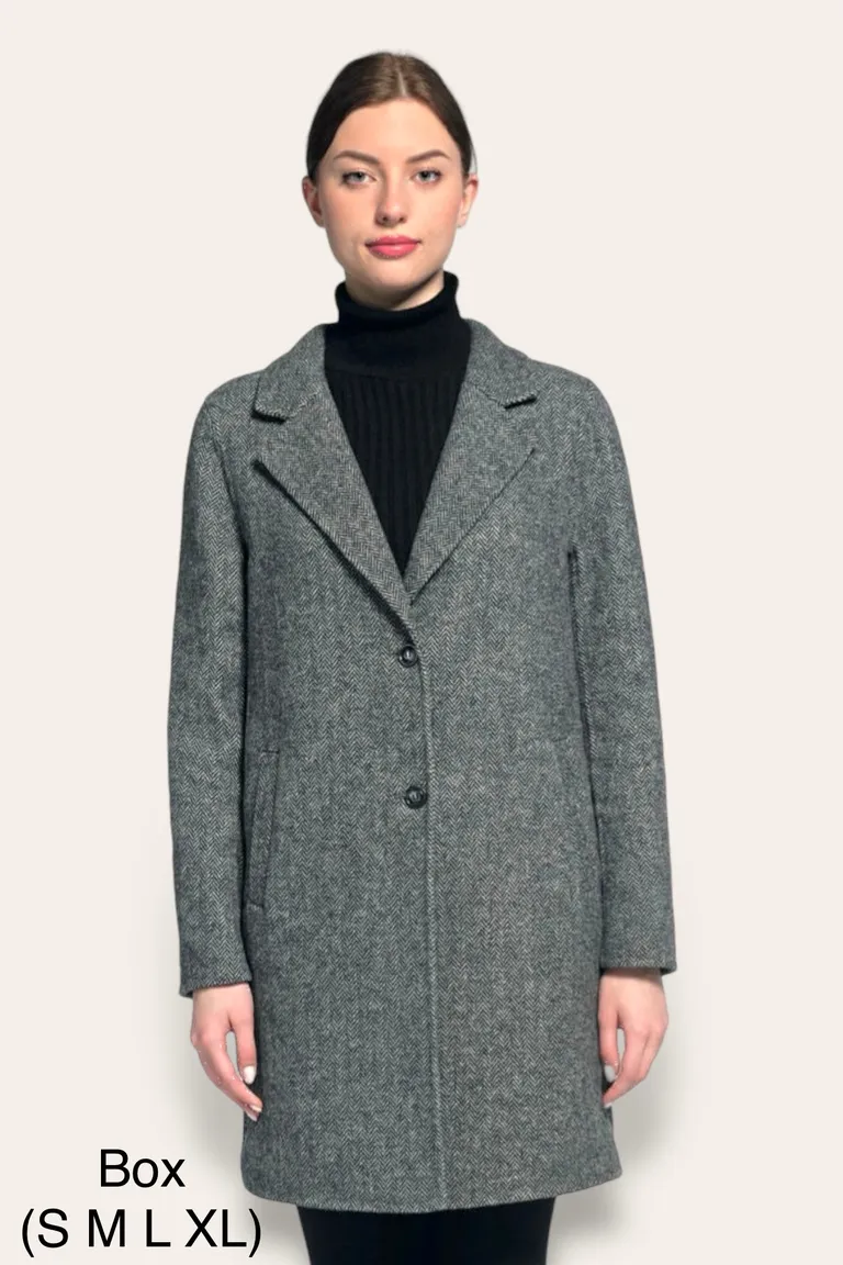 Description Cappotto lungo due bottoni, spigato o principe di Galles