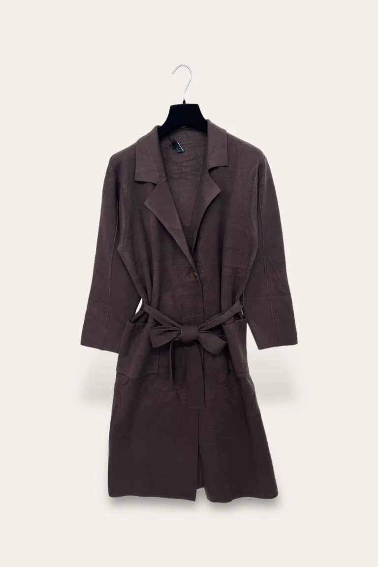 Description Cappotti in maglia, chiusura due bottoni e fascia, due tasche