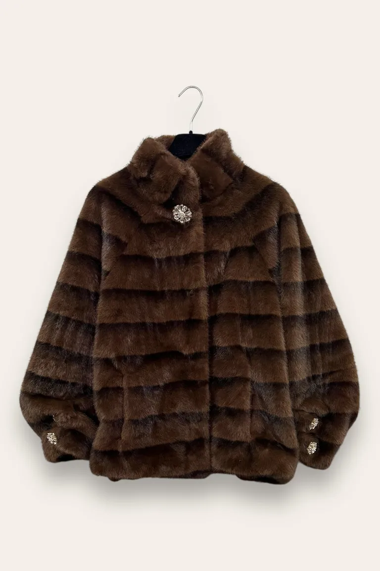 Description Ecopelliccia con bottoni gioiello al collo e alle maniche