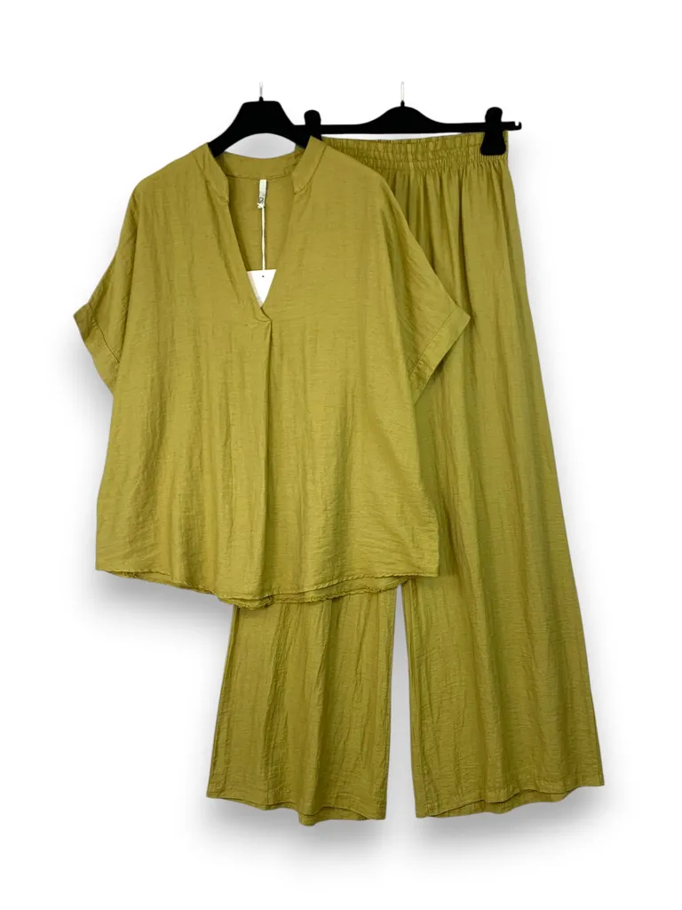 Description Completo blusa over alla coreana con pantalone a palazzo con elastico in vita, misto lino