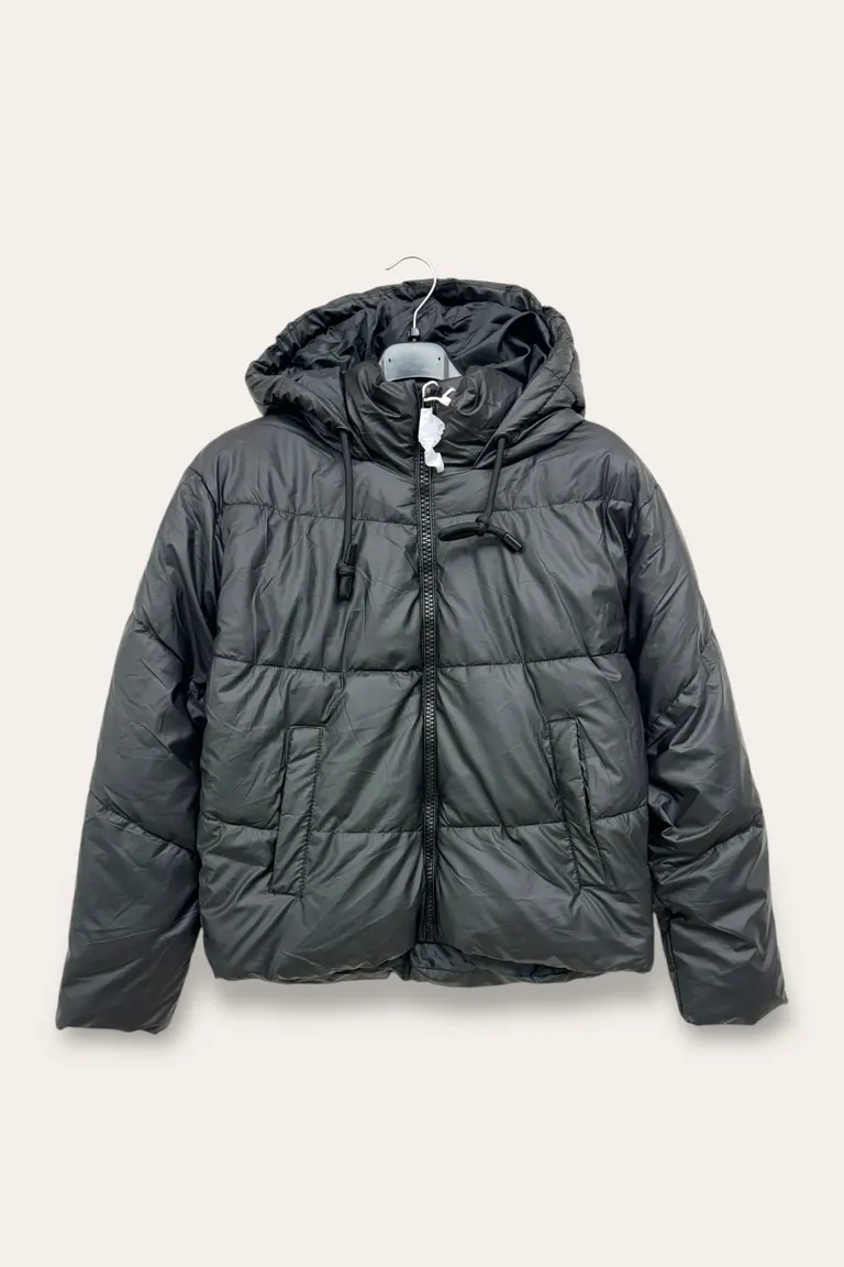 Description Piumino con cappuccio, cerniere frontali e tasche laterali