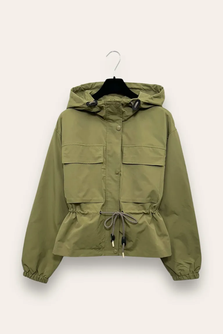 Description Giacca impermeabile con cappuccio e coulisse in vita
