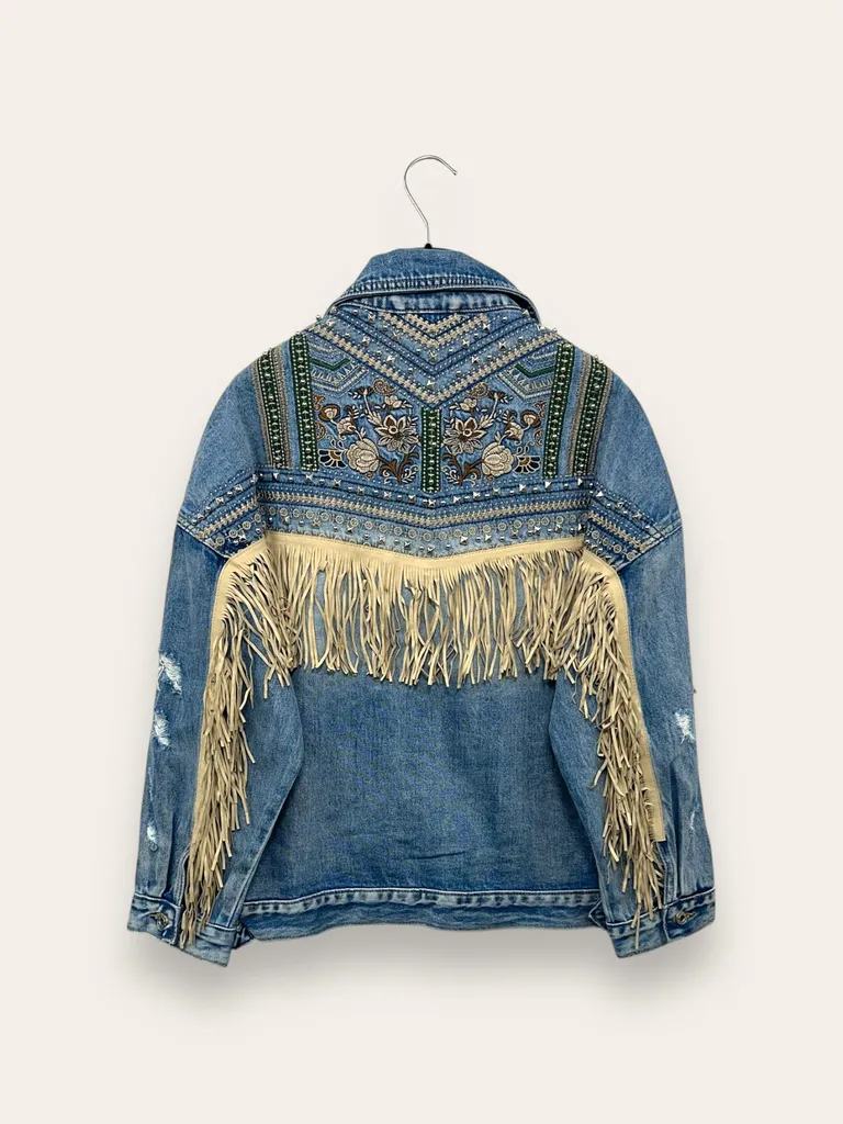 Description Giacca in jeans con ricami, borchie e frange sulka schiena