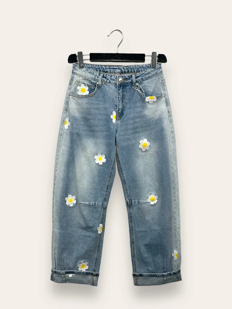 Jeans barrel con margherite ricamate