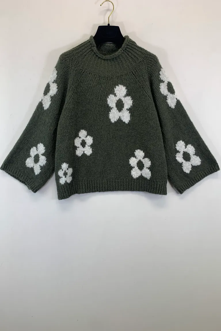Maglia misto lana con collo a vulcano, fantasia fiori