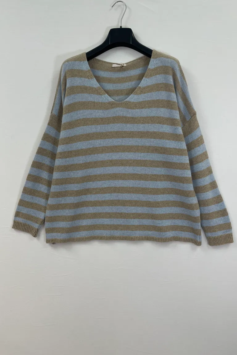 Maglia misto cashmere a righe, scollo a V