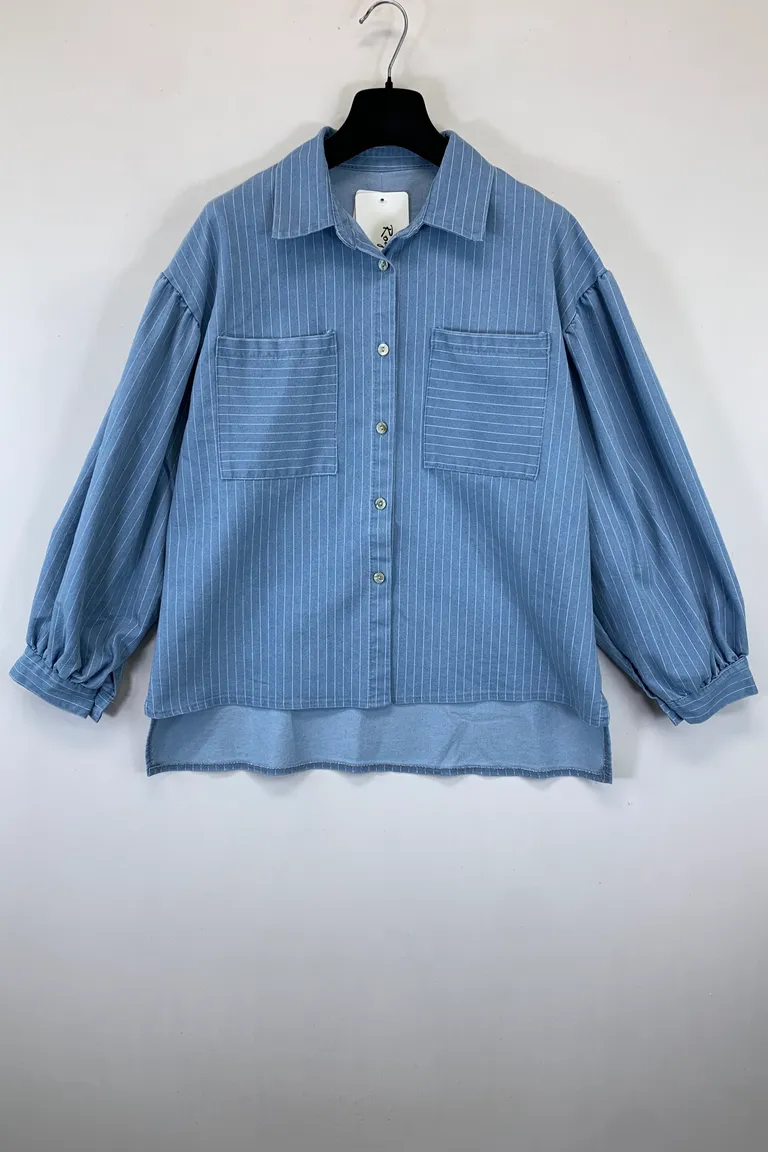 Description Camicia ampia a righe con manica a palloncino, effetto jeans
