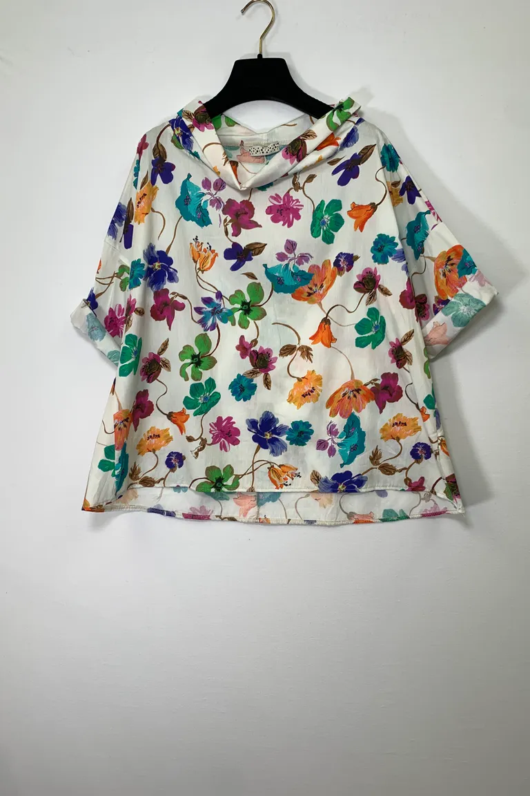 Blusa in cotone con collo a ciambella, manica a 3/4