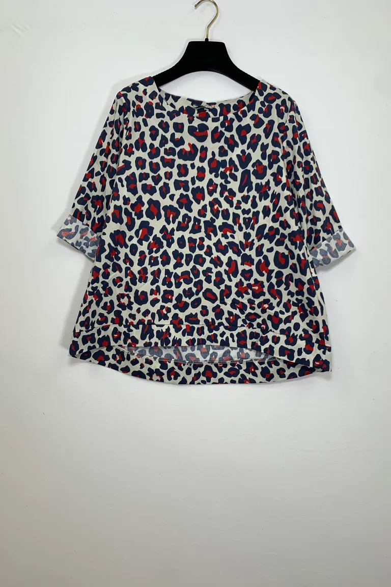 Blusa girocollo in cotone, in fantasia, manica a 3/4