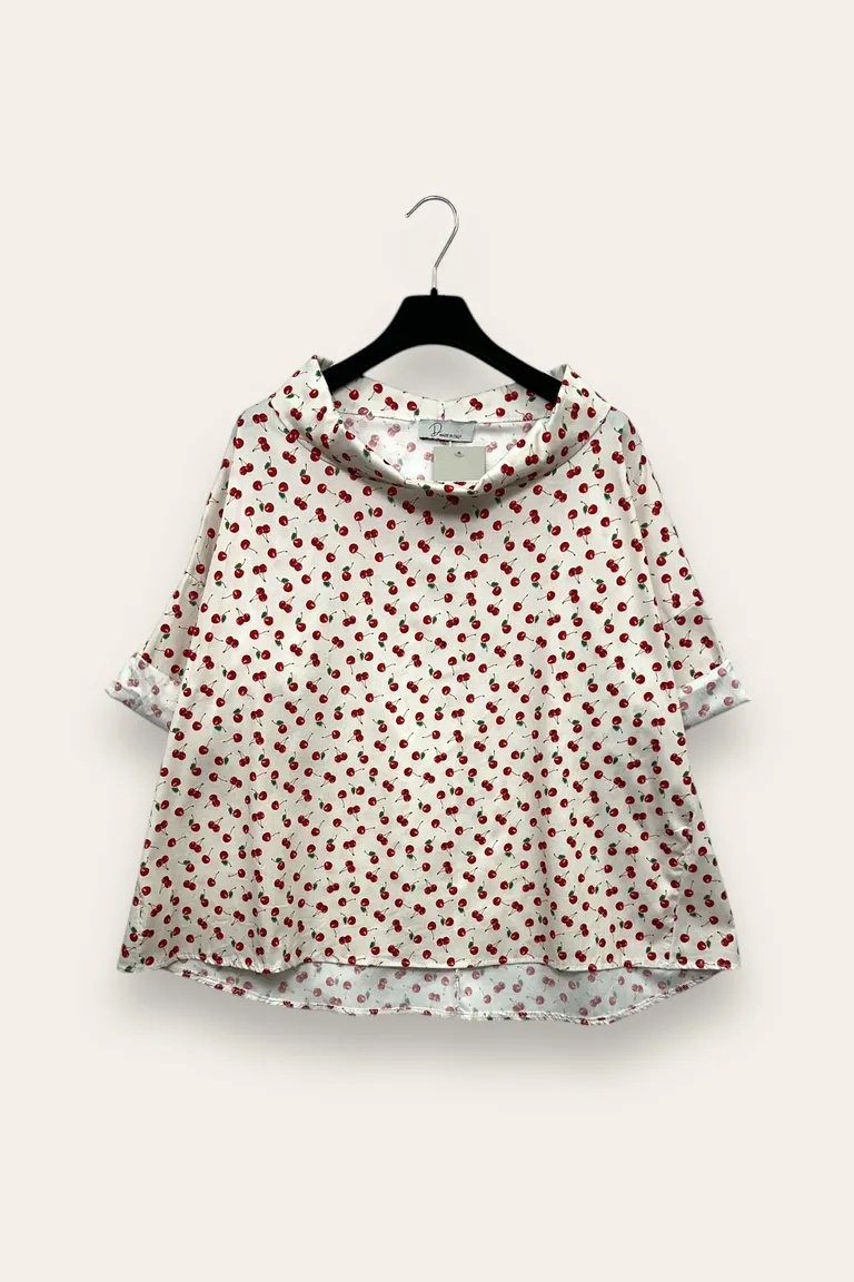 Blusa in cotone con collo a ciambella, manica a 3/4