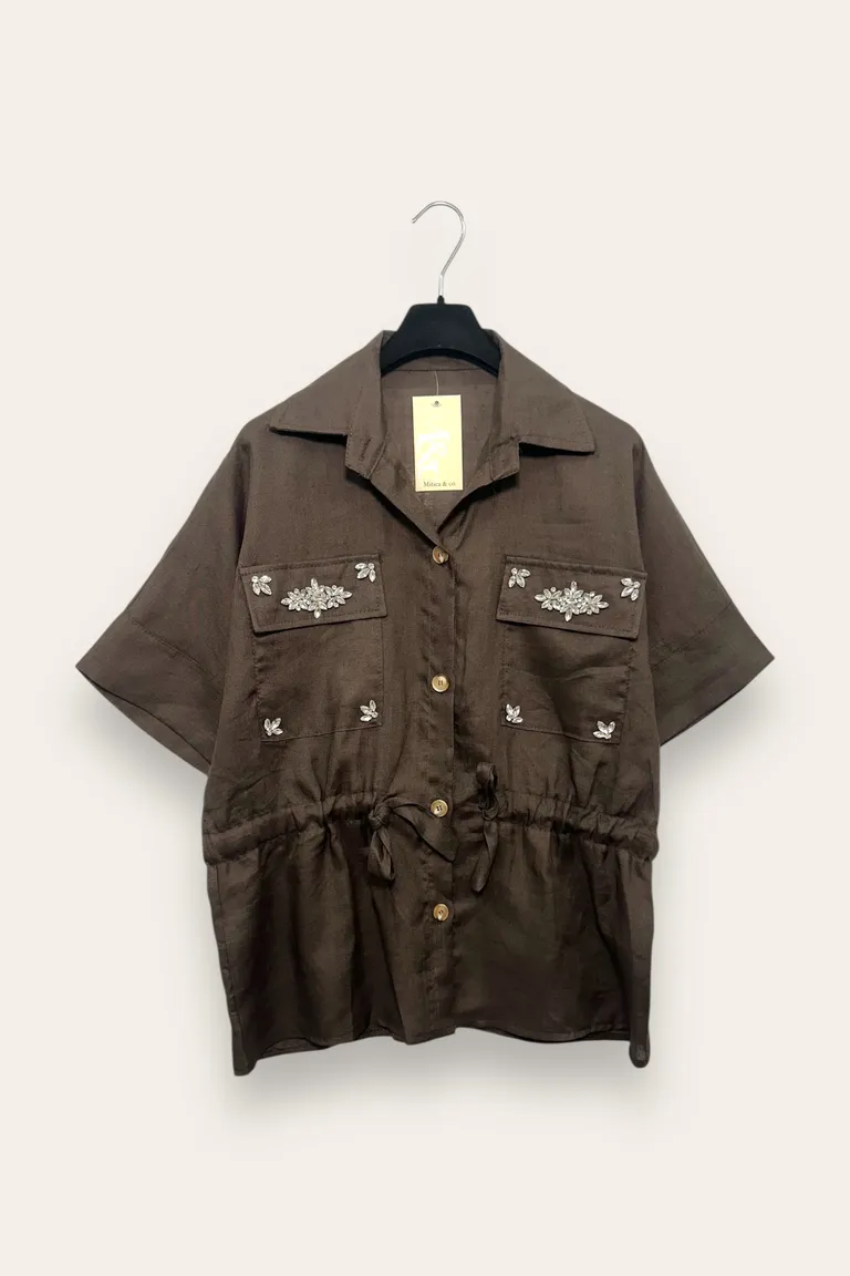 Camicia over in lino con coulisse in vita e strass